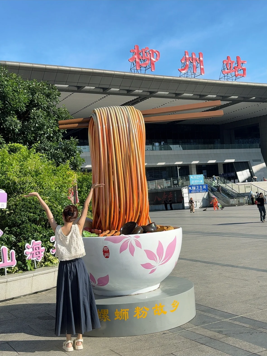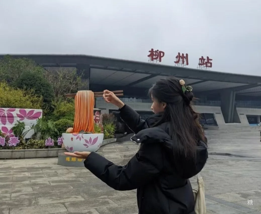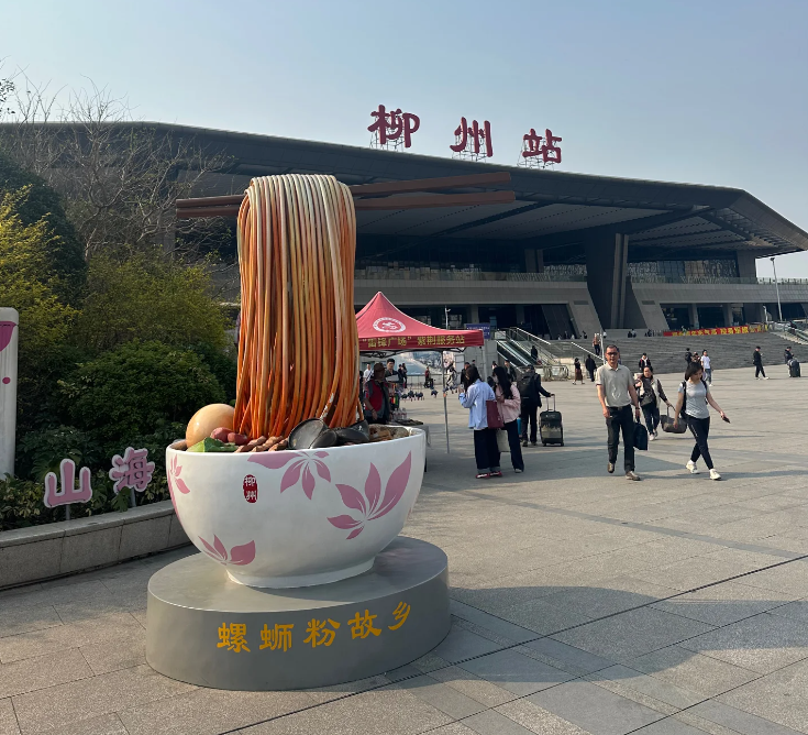 据了解, 2023年国庆节期间,一座柳州螺蛳粉雕塑被安置在柳州火车站东广场上。雕塑的造型独具本地特色,一双筷子从紫荆花图案的碗里,夹起裹满红油的螺蛳粉,碗里还有酸笋、腐竹、青菜、鸭脚、卤蛋等配菜。该雕塑红亮的色泽非常吸引眼球,很快就成为来往旅客青睐的网红打卡点。